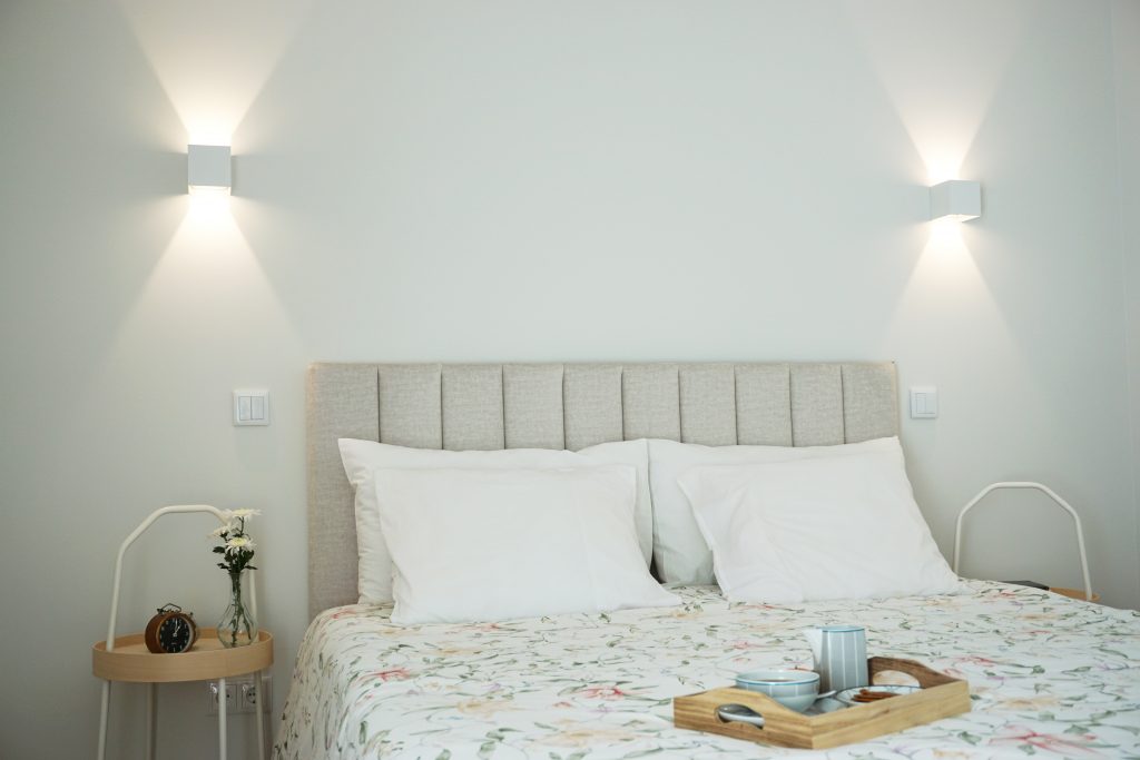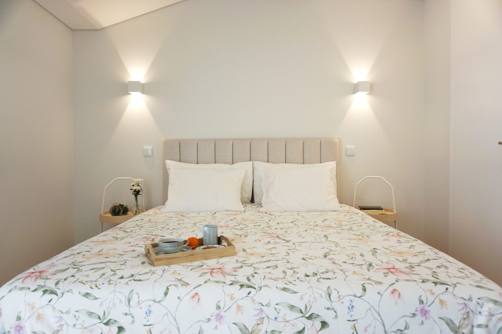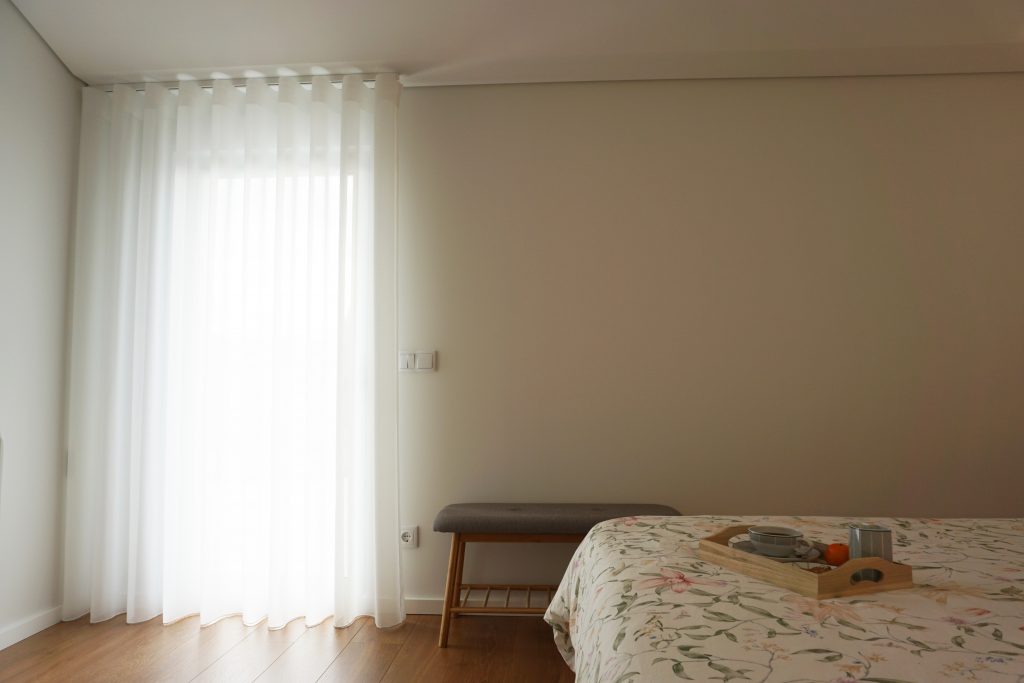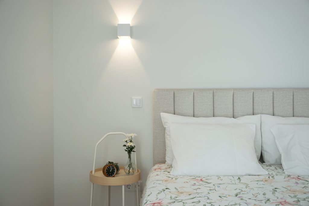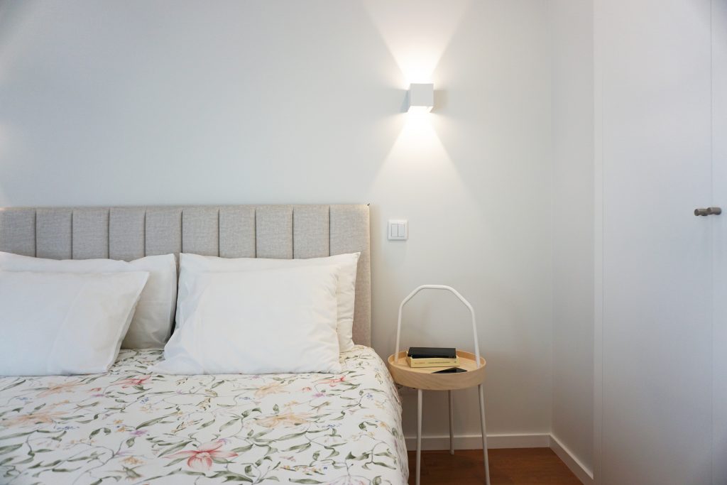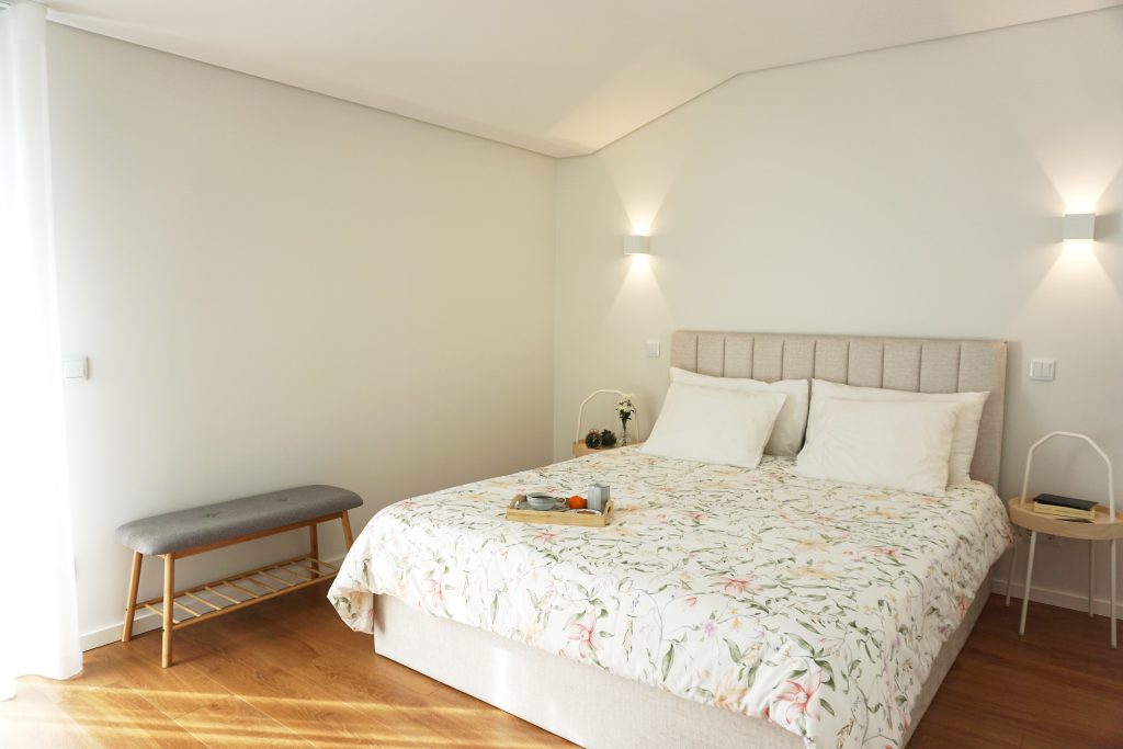O conceito base deste projecto é que o quarto reflita a identidade do casal e por isso a necessidade era criar um espaço simples, calmo, romântico e aconchegante. Para isso optou-se por desenhar uma cama estofada em gomos, com um tecido de cor neutra e clara. As paredes e armários pintados à cor branco, RAL 9003, transmitem um sentimento de espaço limpo, sóbrio e arrumado. Dado que o espaço possui um tecto inclinado, optou-se por colocar uns apliques direcionais na parede da cabeceira da cama. A cor escolhida para a lâmpada led foi uma luz um pouco amarela tornando o ambiente mais quente, íntimo e romântico.